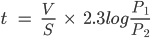 밀폐된 공간(탱크)에서 초기압력부터 최종압력(목표로 하는 흡착압력)까지 배기하는 시간을 구하는 경우에는, 하기의 식으로 산출합니다.